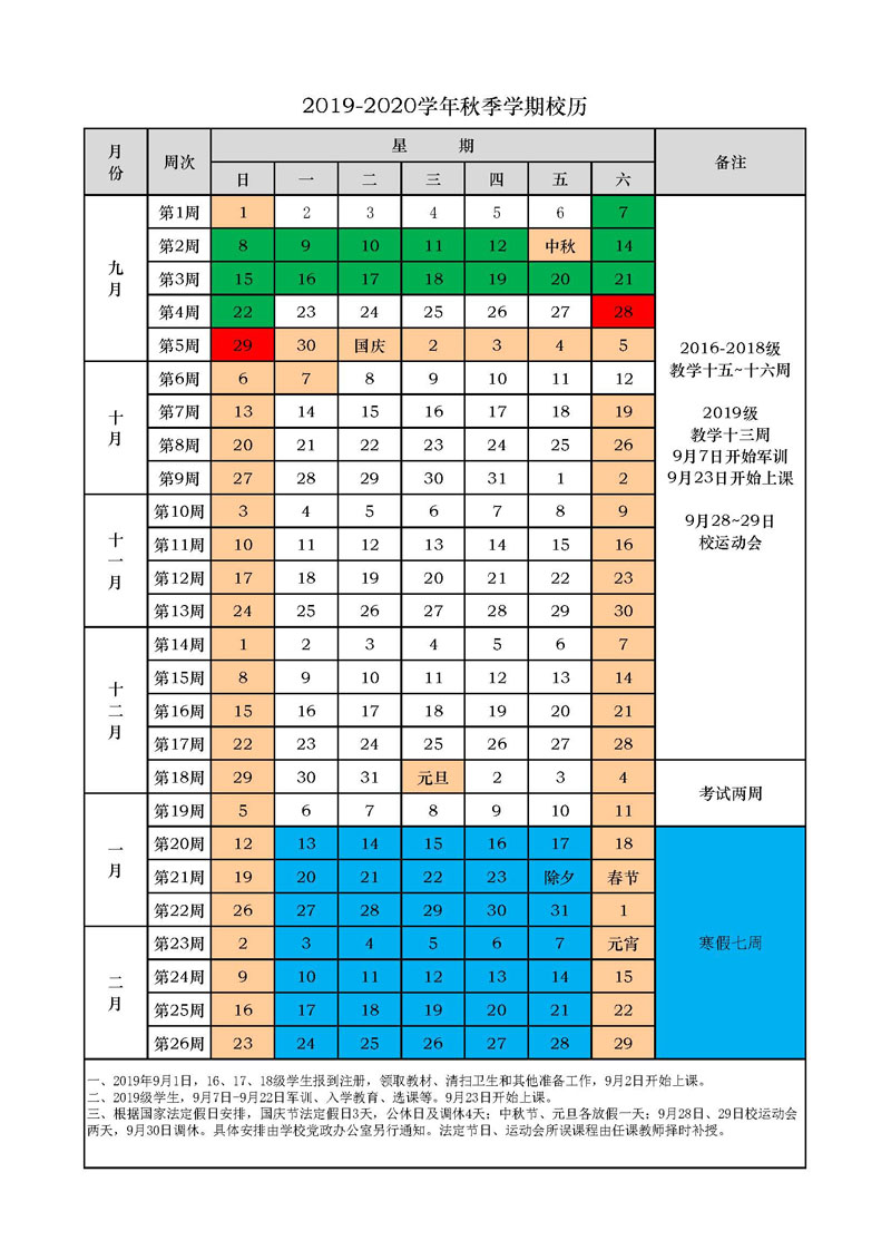 2019-2020学年第一学期(秋季学期)校历