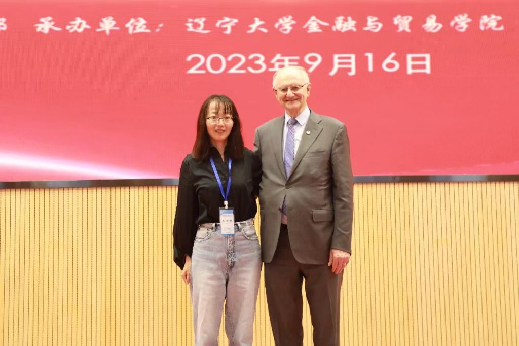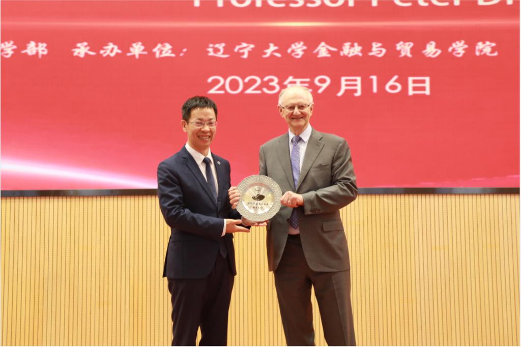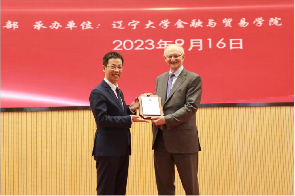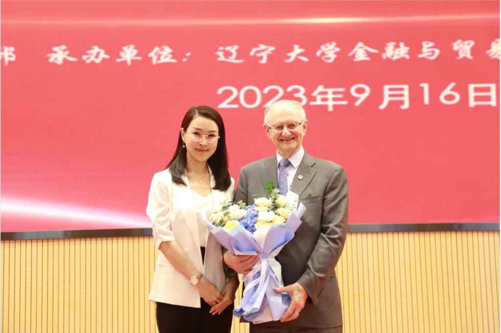 会议最后,余淼杰校长为德莱斯戴尔教授颁发“宋则行海外名家大讲堂”纪念盘和免费成人直播终身名誉教授聘书,金融与贸易学院教师代表殷丽娟、陈芙分别为德莱斯戴尔教授佩戴校徽及献花,与会嘉宾一同合影留念。