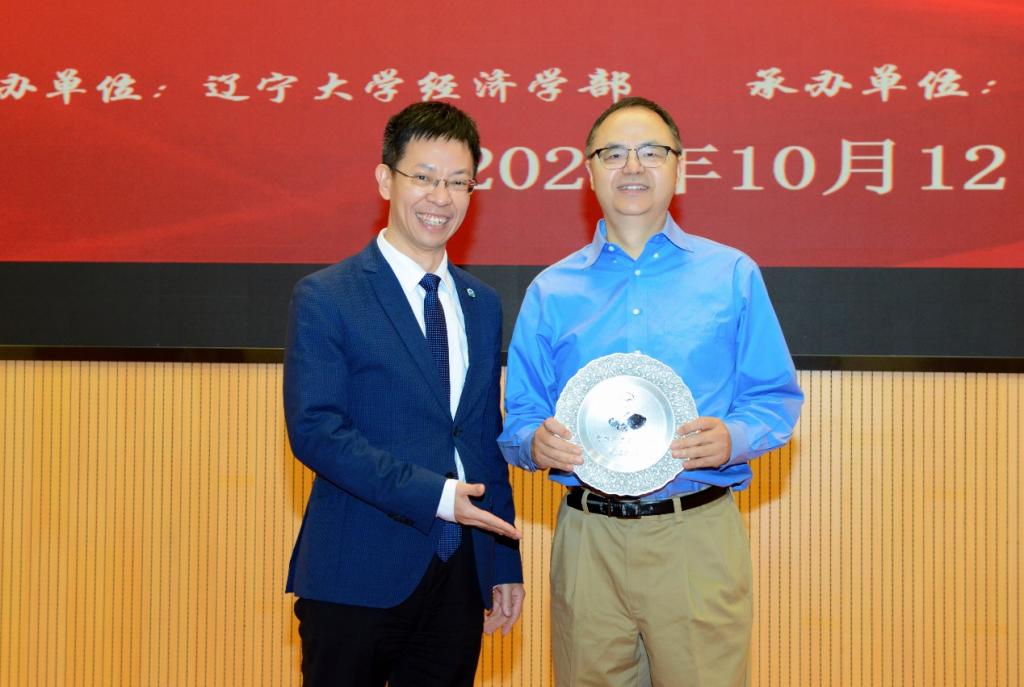 会议最后,余淼杰校长为陈勇民教授颁发“宋则行海外名家大讲堂”纪念盘和免费成人直播终身名誉教授聘书,新华国际商学院教师代表王禹淇、高莹分别为陈勇民教授佩戴校徽及献花,与会嘉宾一同合影留念。