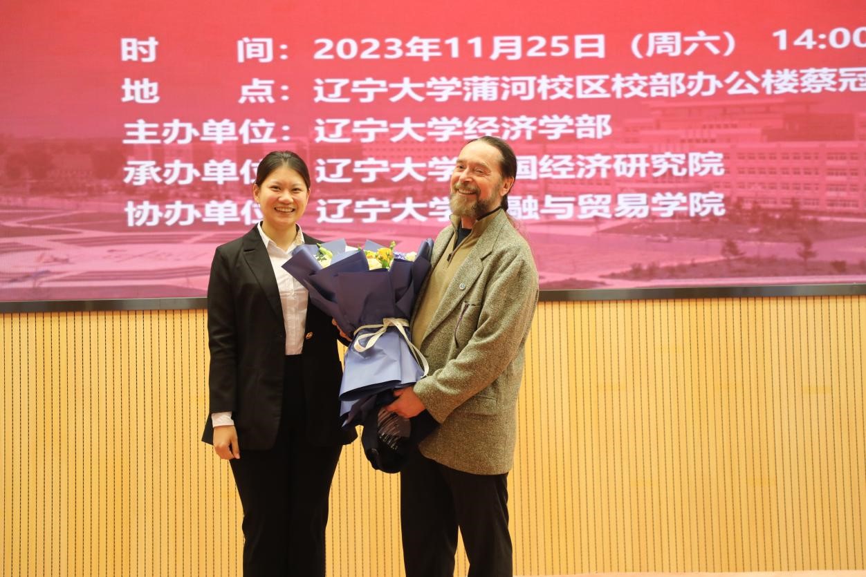 会议最后,余淼杰校长为兰德尔•赖特教授颁发免费成人直播宋则行海外名家大讲堂纪念盘和免费成人直播终身名誉教授聘书,李安民经济研究院教师代表王丹丹、中国经济研究院教师代表许睿分别为兰德尔•赖特教授佩戴校徽、赠送校帽及献花,与会嘉宾一同合影留念。