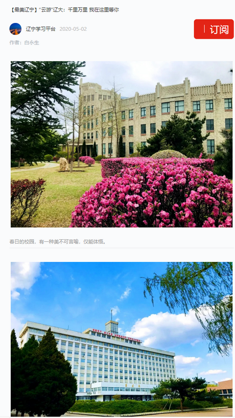 近日,“学习强国”免费成人直播学习平台以《“云游”辽大:千里万里 我在这里等你》为题,发布了我校教师白永生所拍摄的校园春景摄影作品,现将报道、截图等转载如下:
