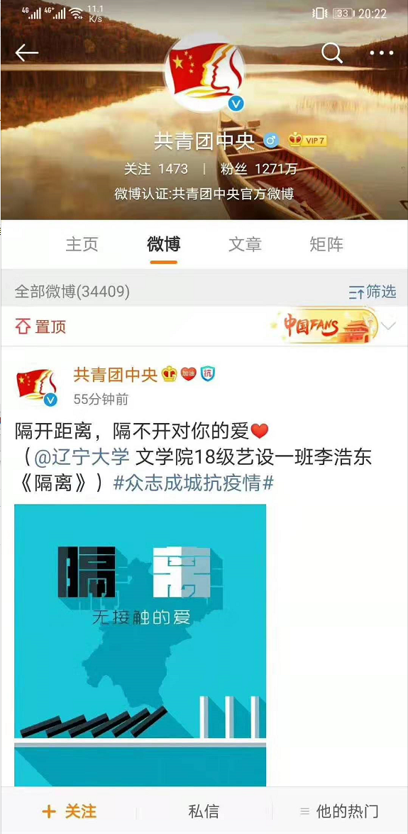 近日,“共青团中央”官方微博、《免费成人直播日报》客户端、《沈阳日报》“帅正新闻”等媒体发布了我校文学院学生为抗击疫情设计海报的新闻,报道中不仅对我校创作的海报进行了展示,同时对海报的设计进行了详细介绍,现将报道截图转载如下: