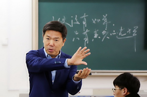 不用任何教案,只拿一只激光笔操控PPT,祁冰老师课堂的第一个45分钟,他一直在大学生中间游走,与大学生实时互动。