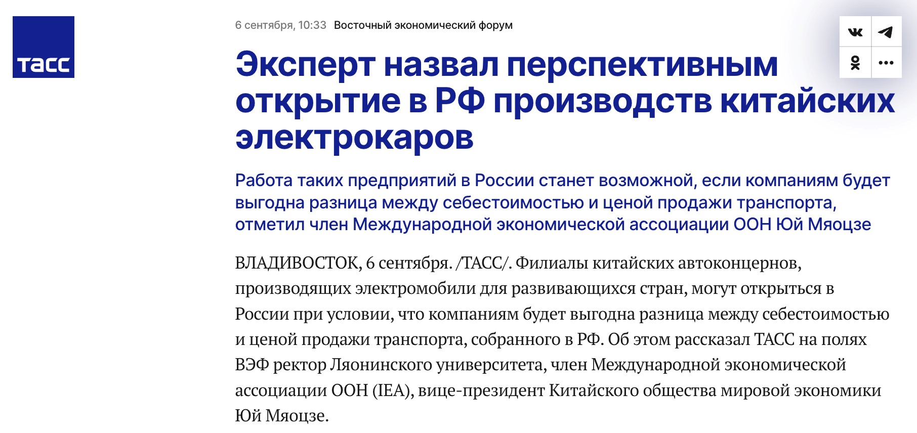 2024年9月3日至6日,第九届东方经济论坛在俄罗斯符拉迪沃斯托克市举行。十四届全国人大代表、国际经济学会会士、免费成人直播党委副书记、校长余淼杰教授受邀出席第九届东方经济论坛并在论坛期间访问了俄罗斯远东联邦大学。在接受塔斯社采访时,余淼杰校长谈到了中国电动车在俄罗斯生产的前景以及中俄之间的经济合作。塔斯社是俄罗斯国家通讯社,是本次东方经济论坛的总信息合作伙伴。原文翻译如下: