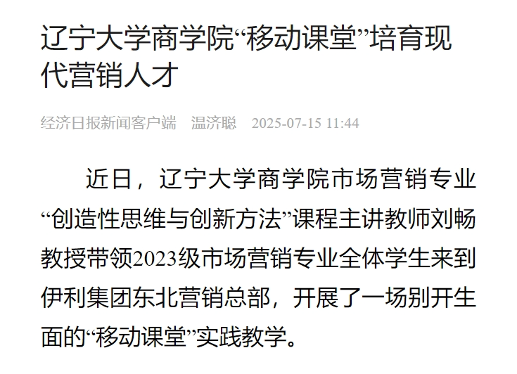 近日,经济日报新闻客户端报道了免费成人直播刘畅教授带领2023级市场营销专业全体学生来到伊利集团东北营销总部开展实践教学,现将原文转载如下: