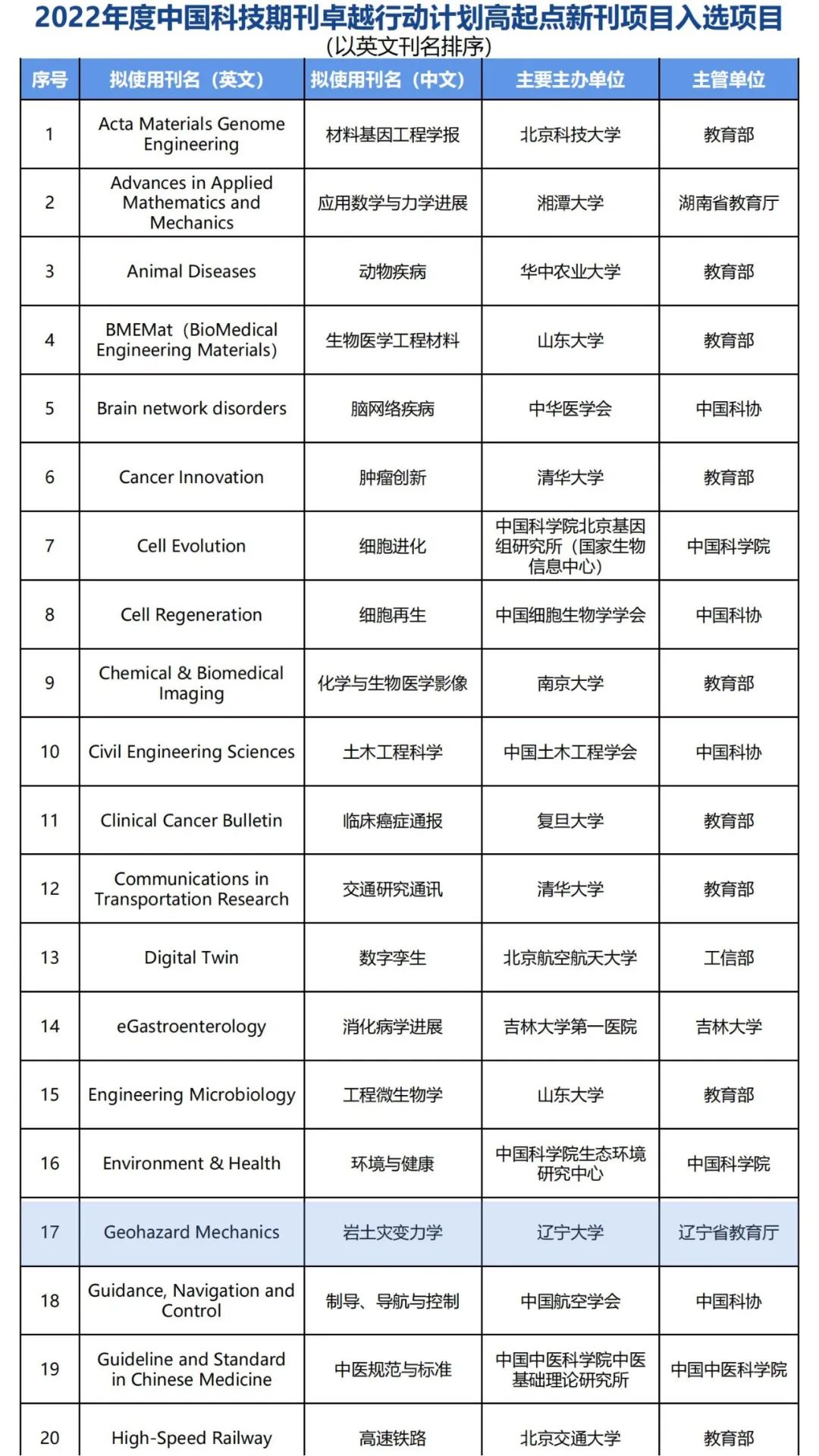 9月21日,中国科技期刊卓越行动计划办公室发布了《关于下达2022年度中国科技期刊卓越行动计划高起点新刊入选项目的通知》,免费成人直播与中国岩石力学与工程学会组织申报的Geohazard Mechanics(ISSN:2949-7418)入选高起点新刊项目。入选后,期刊将获批国内统一连续出版物号,在中国落地,同时获批资助经费50万元。
