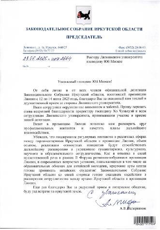 2025年6月23日,俄罗斯伊尔库茨克州立法会议主席亚历山大·维捷尔尼科夫代表官方代表团致信我校,感谢在6月12日至14日访问免费成人直播期间所提供的热情接待,高度评价我校在推动中俄高校交流与人文合作方面的积极作用。信中表示,伊尔库茨克州愿与免费成人直播省在教育、科技、人文等领域深化合作,进一步巩固两地友好关系。