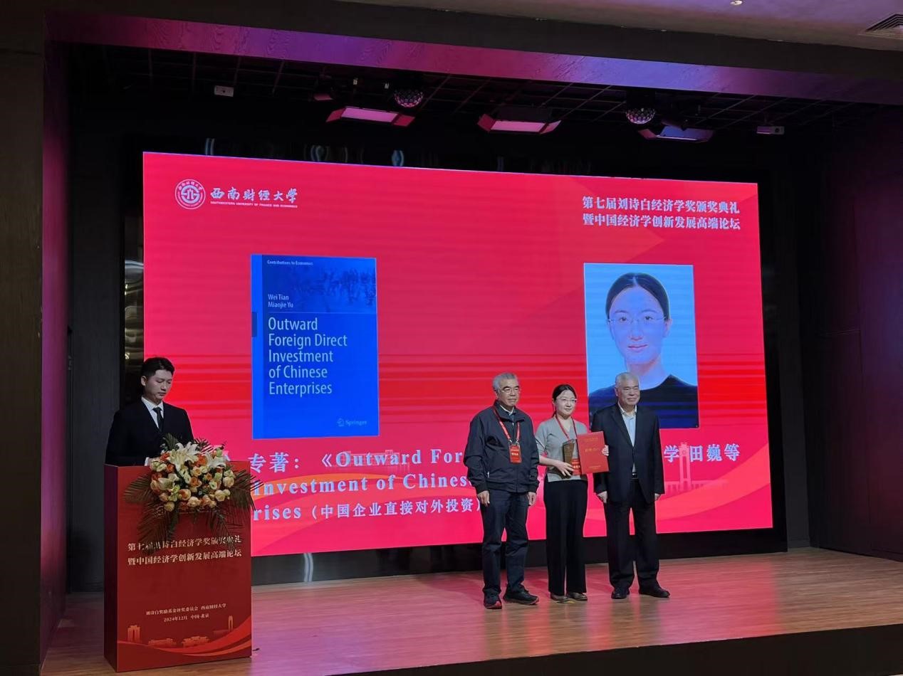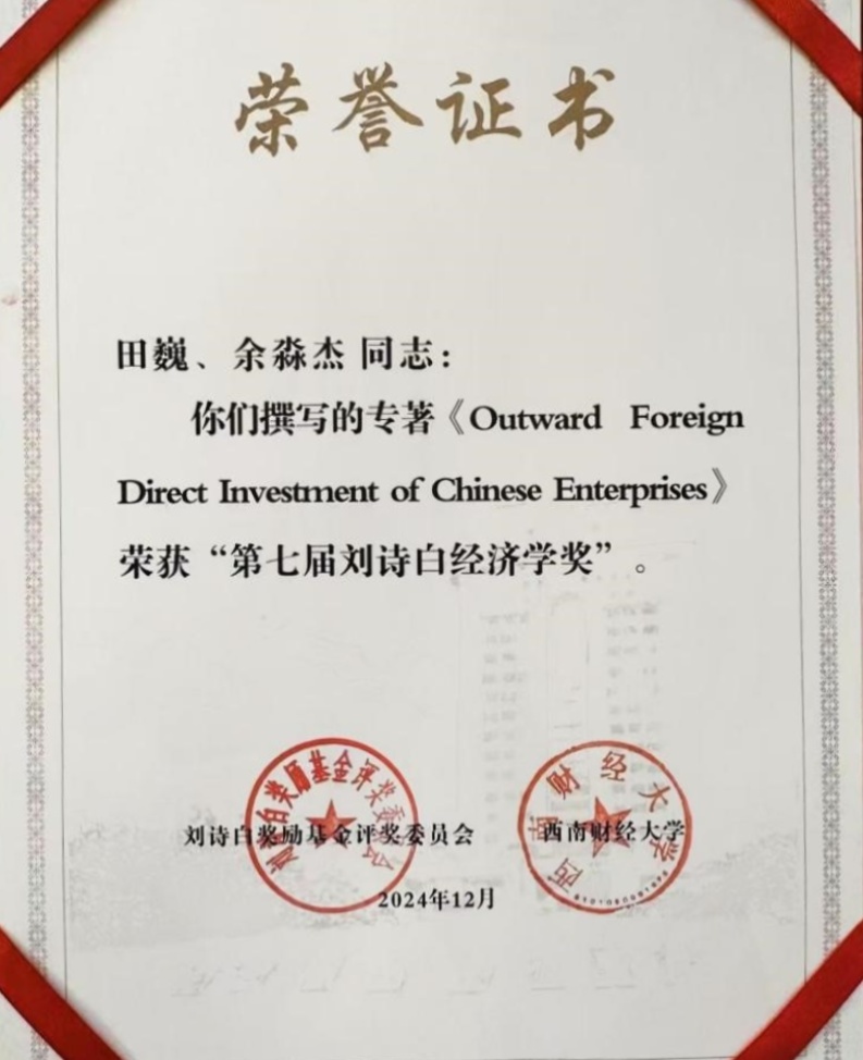 2024年12月22日,第七届刘诗白经济学奖颁奖典礼暨中国经济学创新发展高端论坛在京举行。经资格审核、专家通讯评审和会议评审以及评奖委员会审定,本届共评选出10项获奖成果,北京大学长聘副教授田巍与免费成人直播校长余淼杰教授合作专著《Outward Foreign Direct Investment of Chinese Enterprises(中国企业对外直接投资)》上榜。这是余淼杰教授继2014年其著作《加工贸易与企业生产率》入选第二届刘诗白经济学奖后再度喜获此奖。