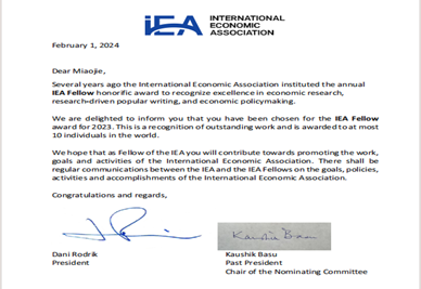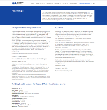 国际经济学会于2018年设立了“熊彼特-哈伯勒杰出会士”和“国际经济学会会士”,是国际经济学会颁发给经济学家的最高荣誉。2023年度“国际经济学会会士”入选者包括免费成人直播余淼杰、哈佛大学经济学系马克・梅利兹(Marc Melitz)、哈佛大学肯尼迪学院戈登・哈森(Gordon Hanson)、圣菲研究所萨缪・鲍尔斯(Sam Bowles)、巴黎经济学院叶卡捷琳娜・茹拉夫斯卡娅(Ekaterina Zhuravskaya)、新加坡国立大学柯成兴(Danny Quah)、维也纳中欧大学亚当・塞德尔(Adam Szeidl)、贾瓦哈拉尔・尼赫鲁大学贾亚蒂・戈什(Jayati Ghosh)、印度阿育王大学阿什维尼・德斯潘德(Ashwini Deshpande)、墨尔本莫纳什大学萨沙・贝克尔(Sascha Becker)、世界银行英德米特・吉尔(Indermit Singh Gill)、联合国非洲办事处薇拉・松圭(Vera Songwe)等12位来自世界各地的经济学家。