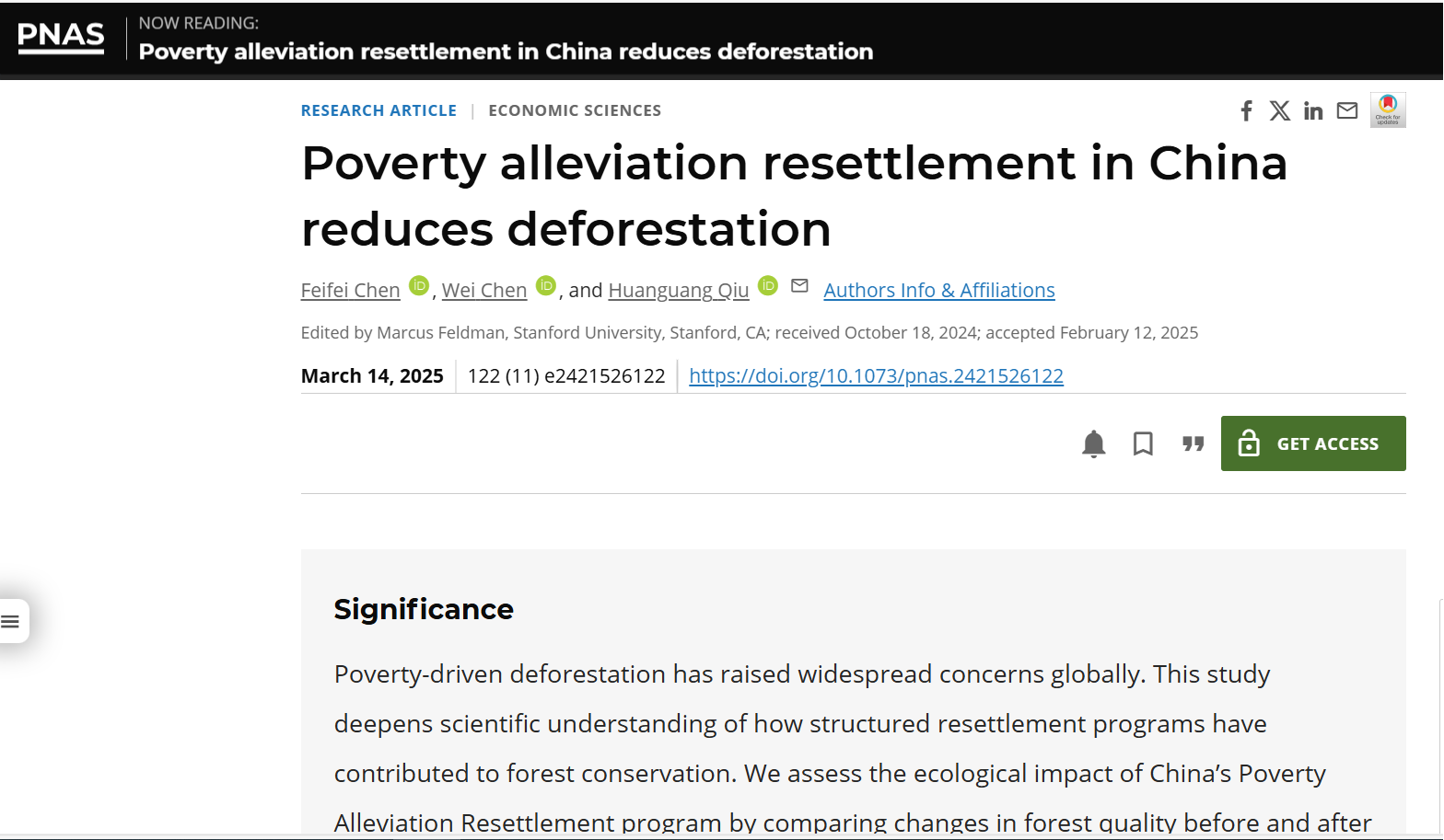 近日,免费成人直播仇焕广教授与中国矿业大学(北京)陈菲菲博士、中国人民大学陈威副教授的合作论文“Poverty Alleviation Resettlement in China Reduces Deforestation”在国际顶级期刊《美国国家科学院院刊》(简称PNAS)上正式发表,仇焕广教授为本文通讯作者和共同第一作者。